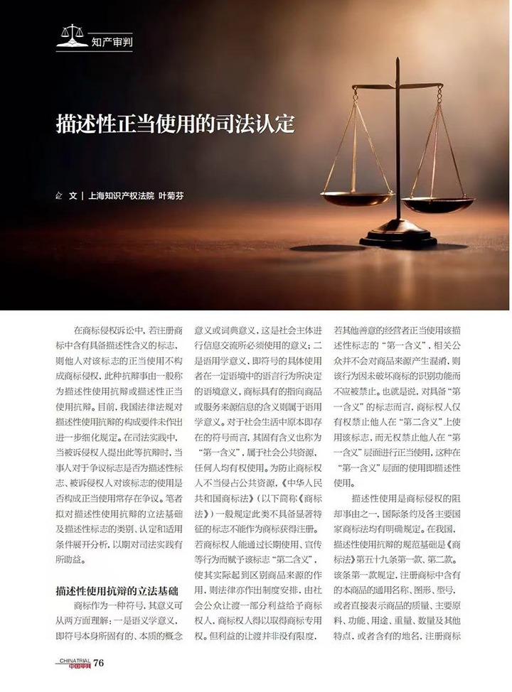 在商标侵权诉讼中,若注册商标中含有具备描述性含义的标志,则他人对该标志的正当使用不构成商标侵权,此种抗辩事由一般称为描述性使用抗辩或描述性正当使用抗辩。目前,我国法律法规对描述性使用抗辩的构成要件未作出进一步细化规定。在司法实践中,当被诉侵权人提出此等抗辩时,当事人对于争议标志是否为描述性标志、被诉侵权人对该标志的使用是否构成正当使用常存在争议。笔者拟对描述性使用抗辩的立法基础及描述性标志的类别、认定和适用条件展开分析,以期对司法实践有所助益。